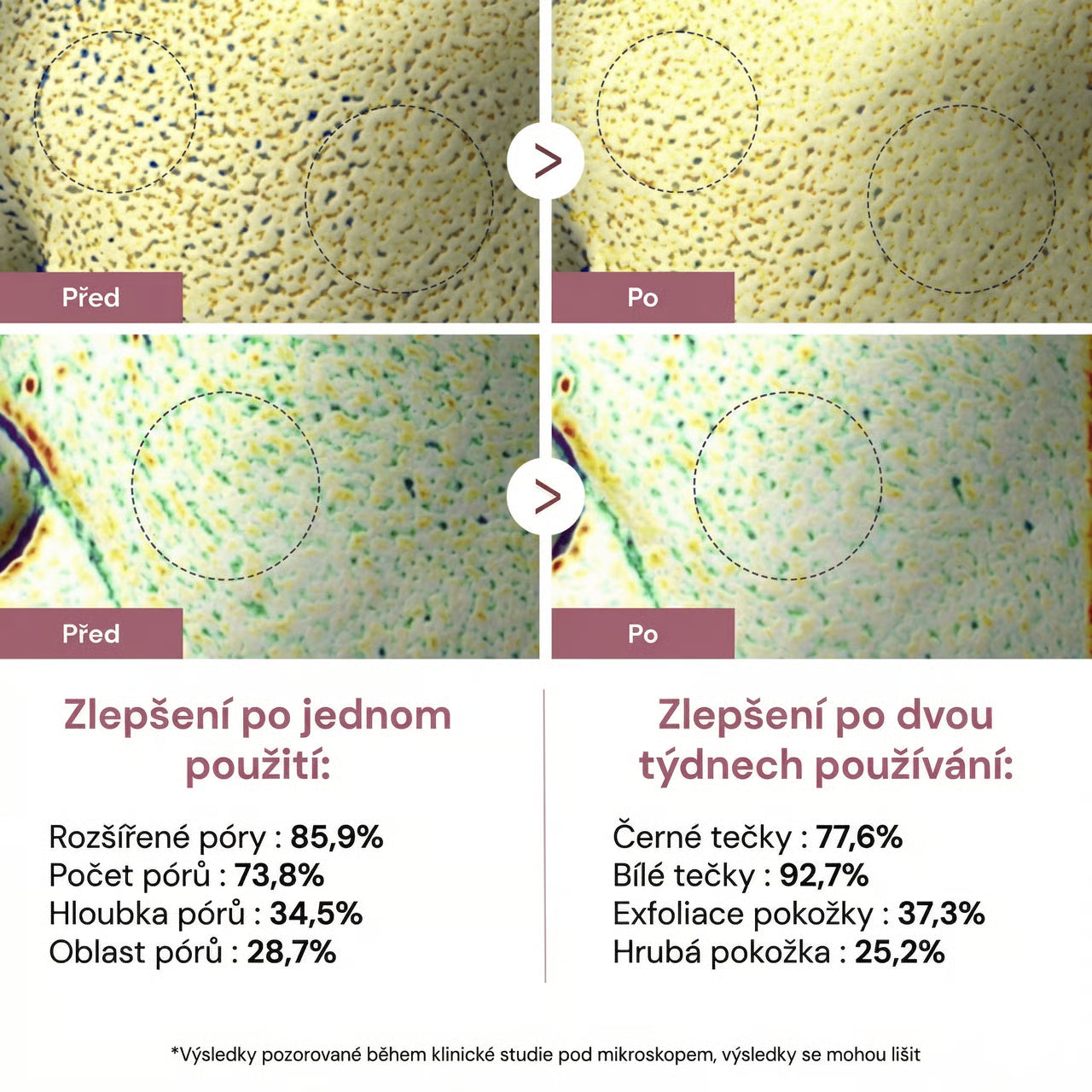 Většina zákaznic zaznamená hladší a čistší pleť už po prvním použití. Při pravidelném používání se výsledky dále zlepšují během 2–3 týdnů.